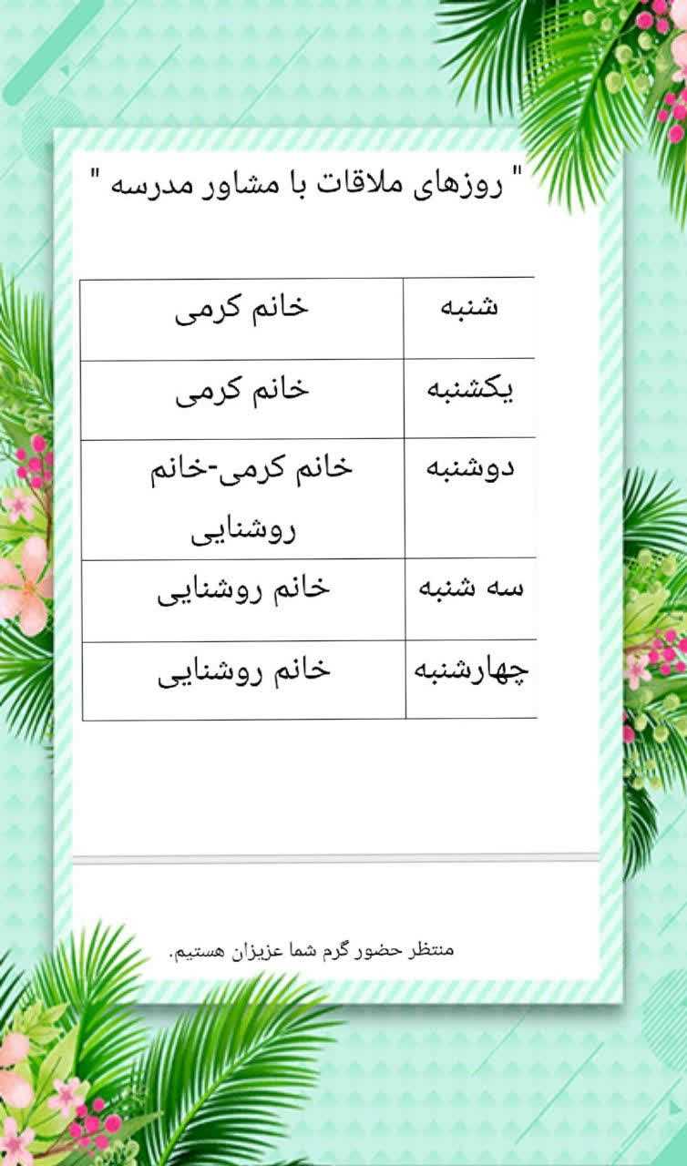 با سلام و احترام برنامه روزهای حضور مشاوران محترم در هنرستان به پیوست تقدیم میگردد. اولیای گرامی میتوانند با هماهنگی قبلی، در روزهای مشخصشده با مشاوران دیدار و گفتوگو داشته باشند.